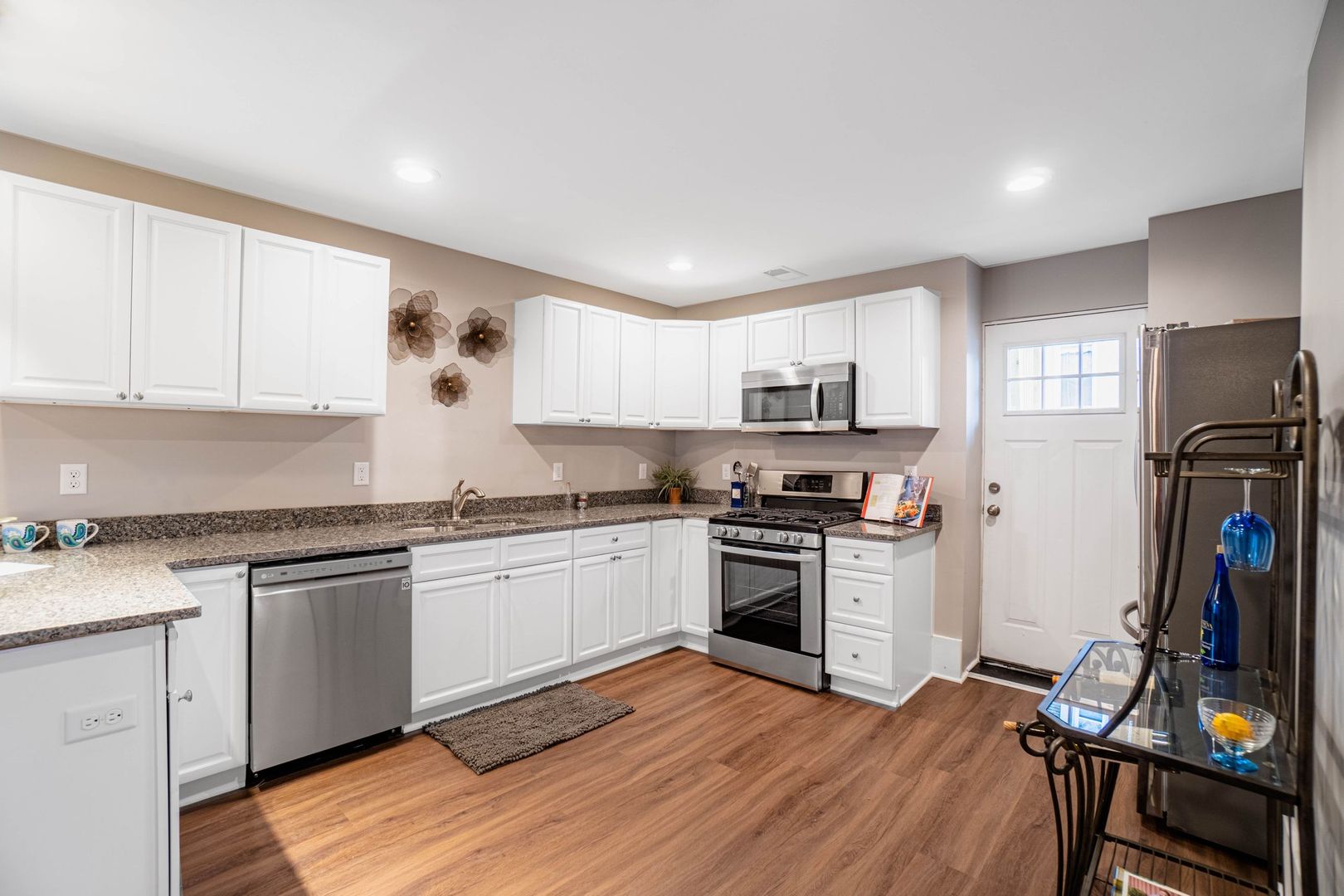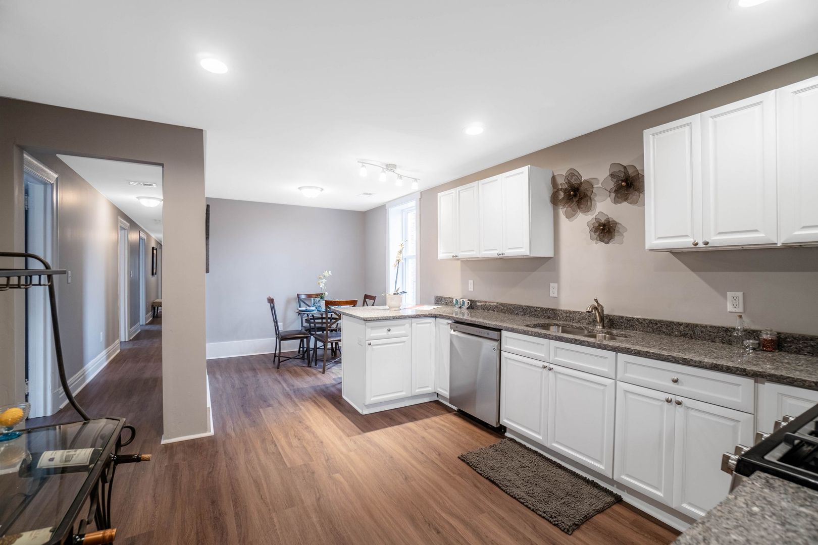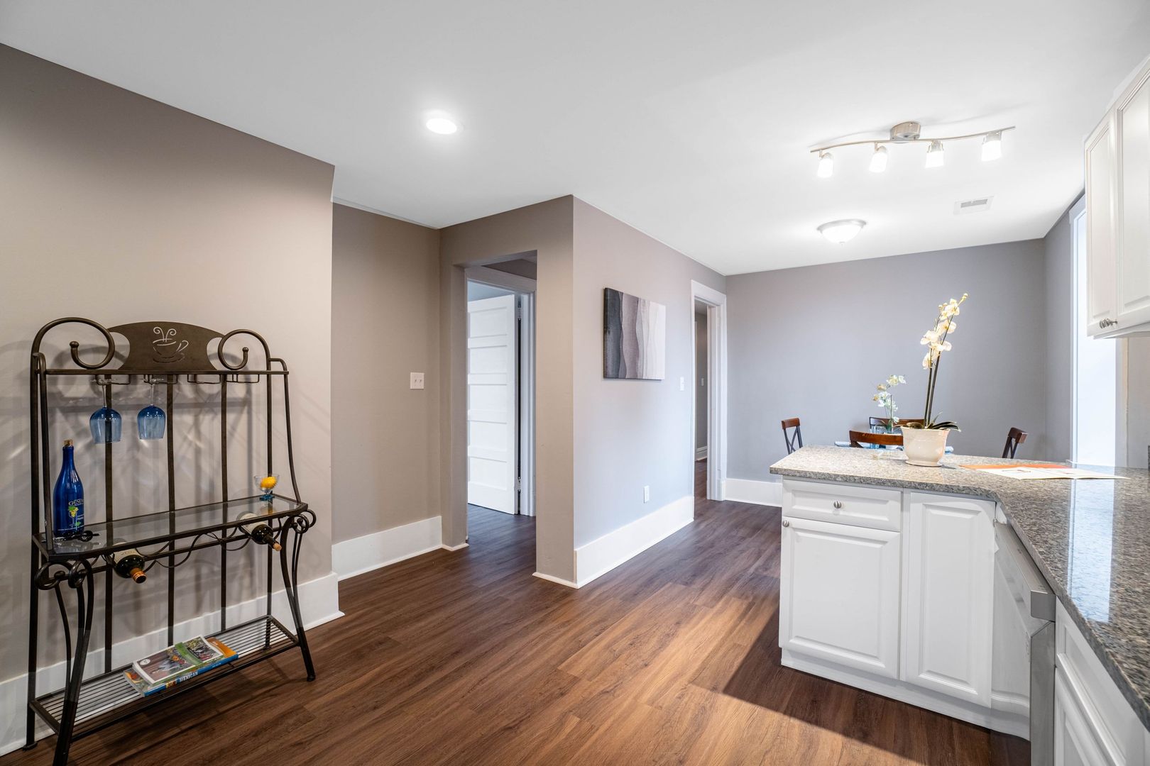 Updated kitchen with new cabinetry, granite countertops, stainless steel appliances, and peninsula for casual eating.